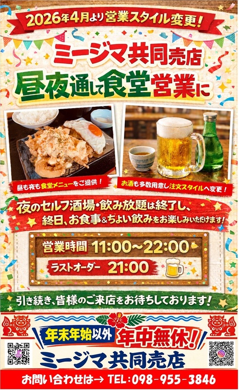 ミージマ共同売店は、昼は沖縄そばや定食が楽しめる大衆食堂、夜は沖縄の郷土料理を味わえる居酒屋、そして昼夜を通して営業している小さな売店がひとつになった、地域密着型のお店です。